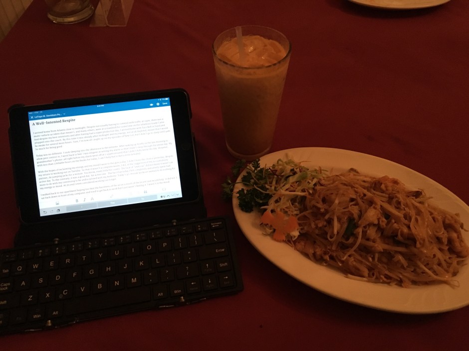 I walked back to our apartment hoping too that the freshness of the air as a result of the recent rain would help. It did not. I sat back down in front of my computer and tried to get back to work but I just wasn’t feeling it. I wasn’t in the mood. I puttered around for a bit but it was already after 7pm and I needed to consider what I’d eat. I don’t cook. I never derived any pleasure from it and simply don’t do much cooking. I tell my hubby that that’s what he’s there for! He enjoys the kitchen. However, today, I needed to escape from the confines of our home,  needed the comfort food from my favorite restaurant. It is here that I sit, contently typing while I eat.